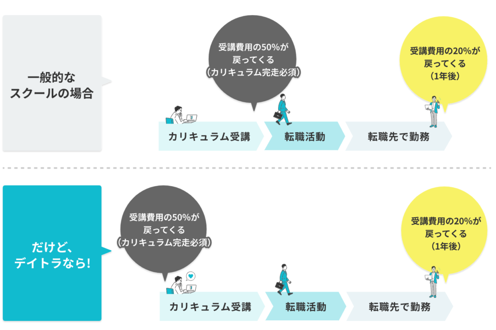 デイトラのリスキリング転職コースでは、受講開始時点で補助金が適用され、受講費用の税抜き50%が戻ってきます。(ただし、カリキュラムを完了することが必須です!)