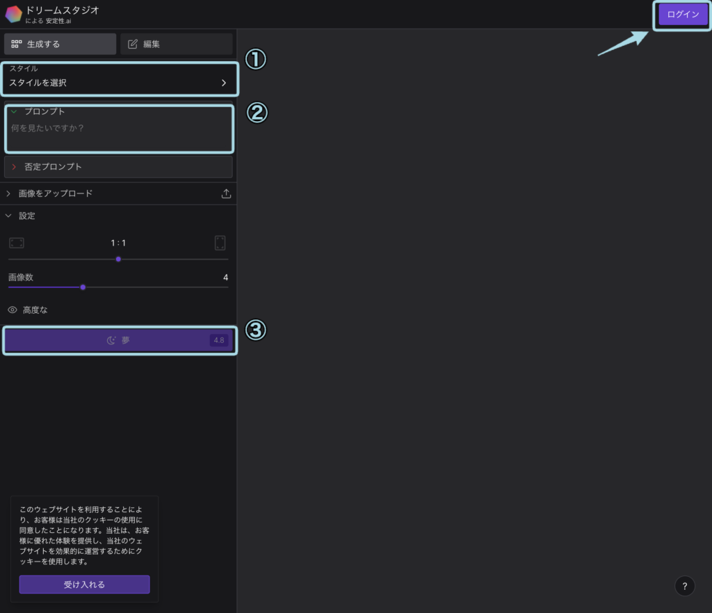 細かい設定もできますが、①のスタイル選択②プロンプト入力のみでも画像は生成されます。