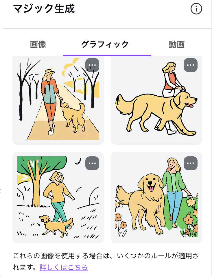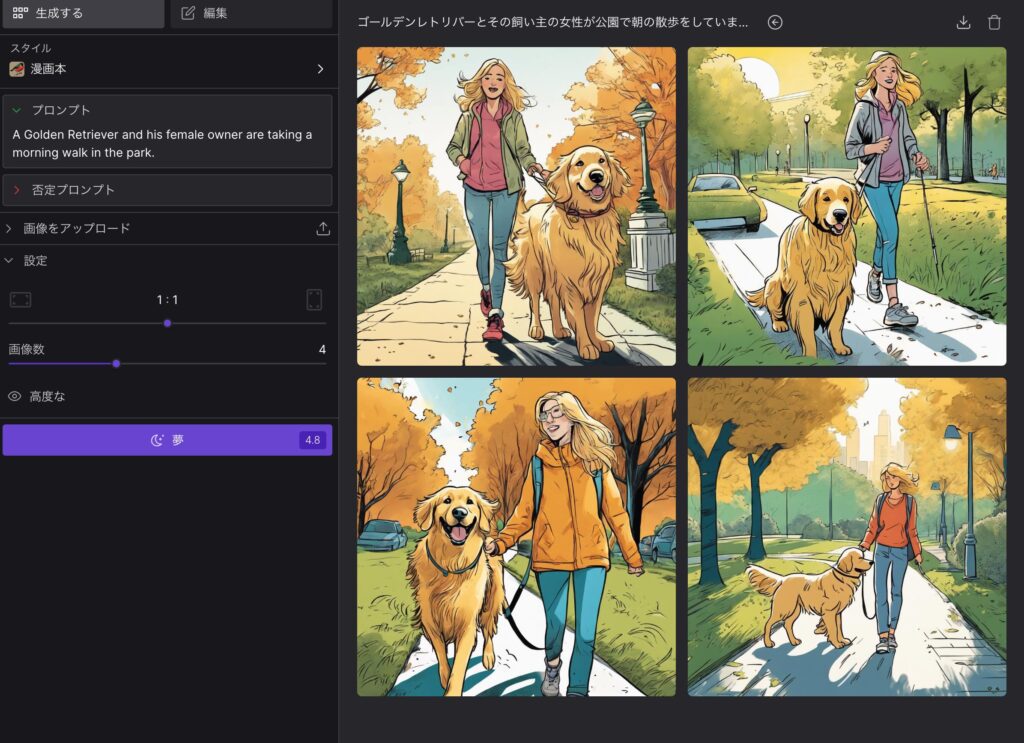 プロンプトに「ゴールデンレトリバー 飼い主の女性 公園 散歩 朝」と入力してみると…