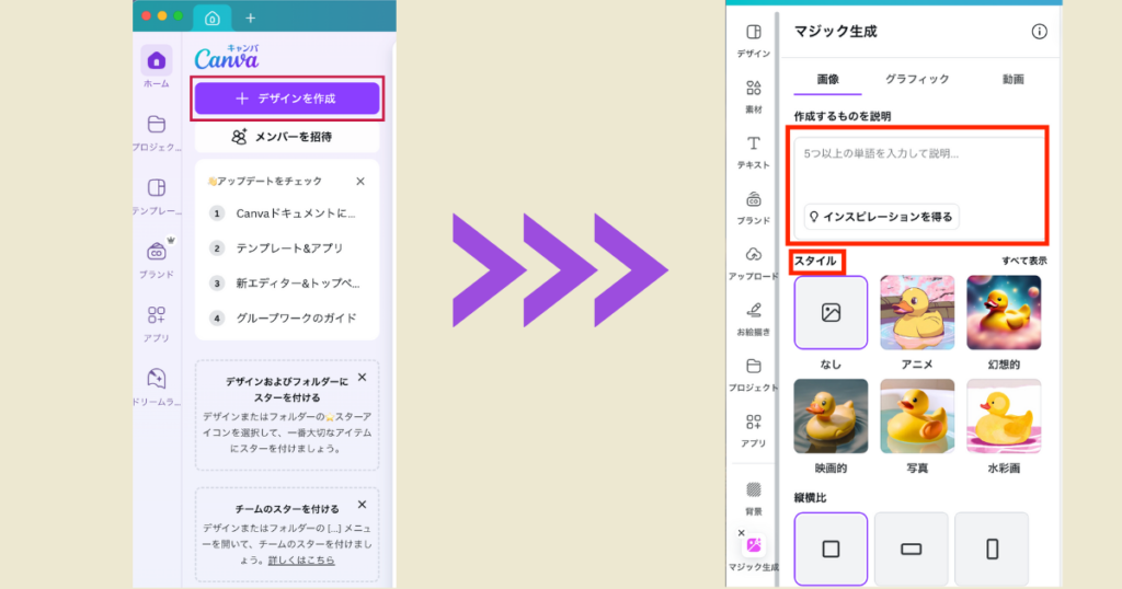 Canvaを使った画像生成は、トップ画面の左側にある「デザイン作成」をタップ、「マジック生成」を選択すると、簡単に始められます。