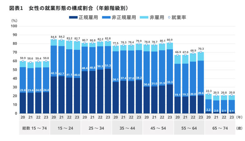 「50代から正社員として雇ってもらえるの?」と思うかもしれませんが、2020年から2023年までの、女性の就業率と就業形態の構成割合をみてみると、就業率は15〜24歳と65〜74歳では低下していますが、それ以外の幅広い年齢層で上昇が続いています。